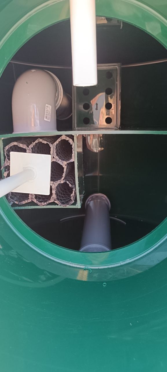 Представляет собой горизонтальную цилиндрическую пластиковую емкость, разделенную на три камеры очистки.
